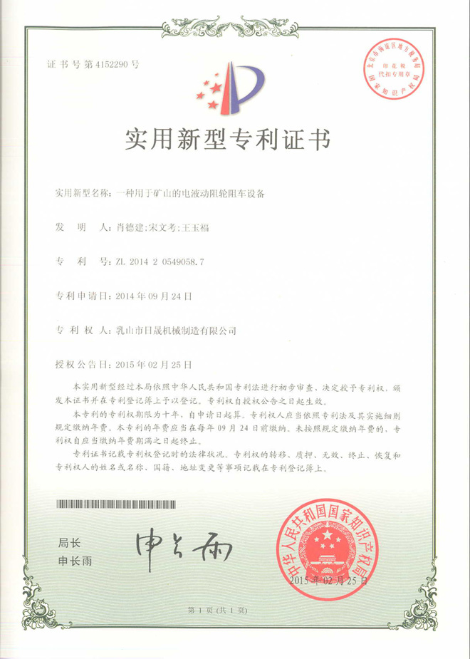 Patent certificate---Electric-hydraulic resistance wheel retarder